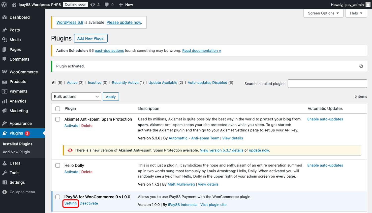 - Klik Activate pada salah satu plugin iPay88 yang baru di-install.